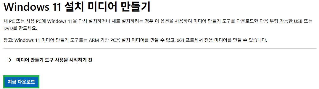 이 옵션은 부팅 가능한 설치 미디어(USB 플래시 드라이브, DVD)를 만들거나 가상 컴퓨터(.ISO 파일)을 만들어 Windows 11을 설치하려는 사용자를 위한 옵션입니다. 이 다운로드는 제품 키를 통해 올바