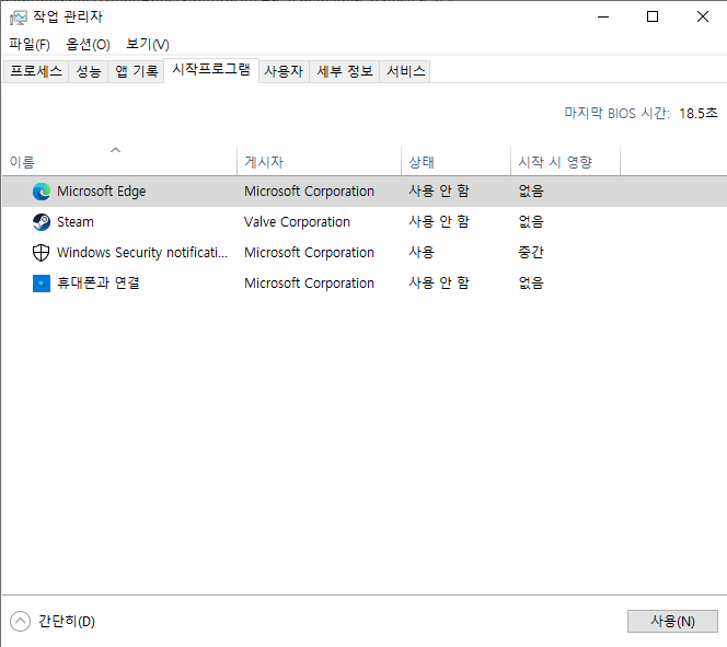 CTRL + SHIFT + ESC 를 통해 작업관리자의 시작프로그램을 들어갑니다.