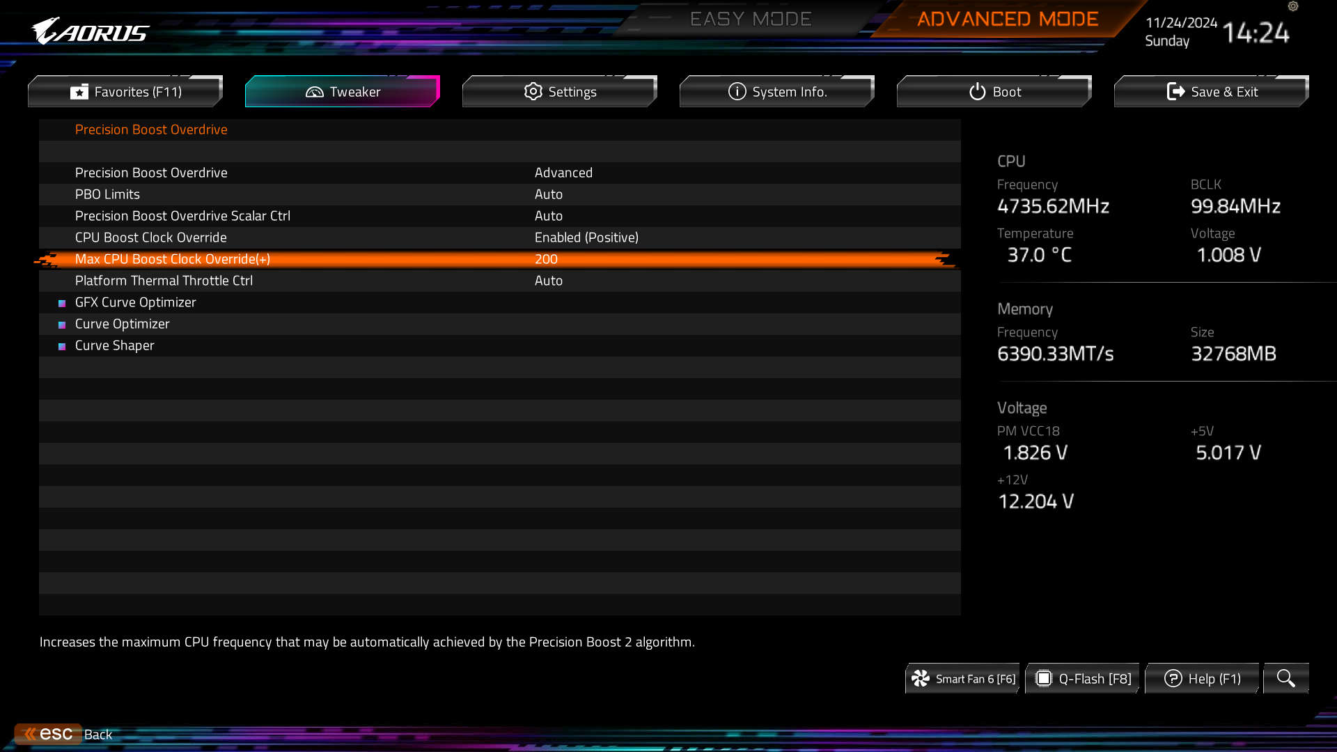 MAX CPU Boost Clock Override(+) : 200